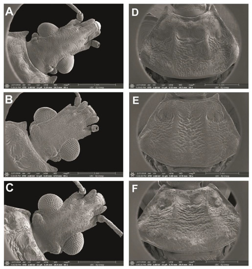 Dorsal view of head: (A) P. arthuri, (B) P. coreodes and (C) P. tertius. Pronotum: (D) P. arthuri, (E) P. coreodes and (F) P. tertius.