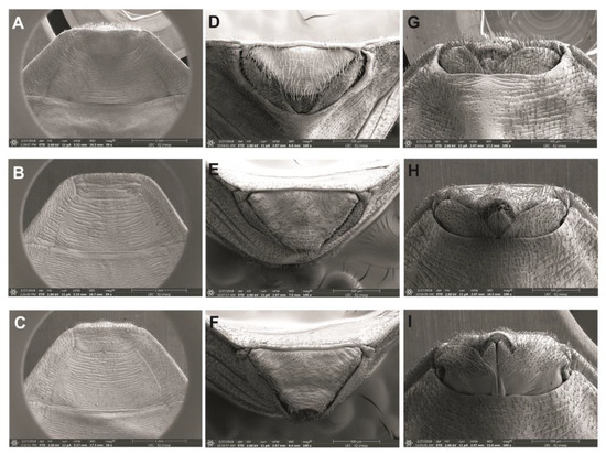 Female external genitalia using SEM. Dorsal view: (A) P. arthuri, (B) P. coreodes and (C) P. tertius. Posterior view: (D) P. arthuri, (E) P. coreodes and (F) P. tertius. Ventral view: (G) P. arthuri, (H) P. coreodes and (I) P. tertius.