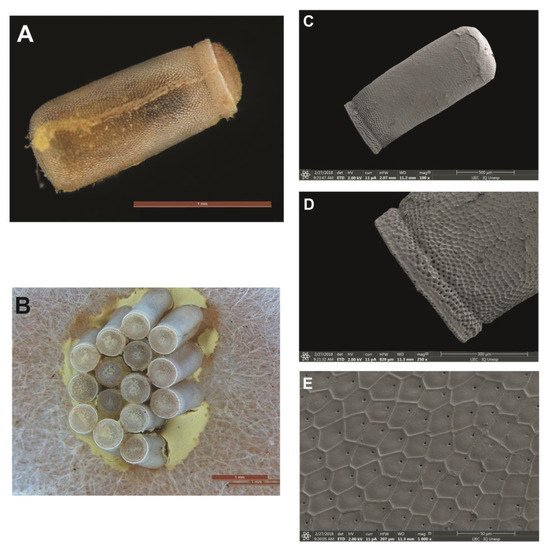 Eggs of P. arthuri. (A) Eggs by means of optical microscopy; (B) eggs adhered together in a substrate; (C) eggshells by means of scanning electron microscopy; (D) detail of the chorion border by means of SEM and (E) pattern of an exocorial cell by SEM.