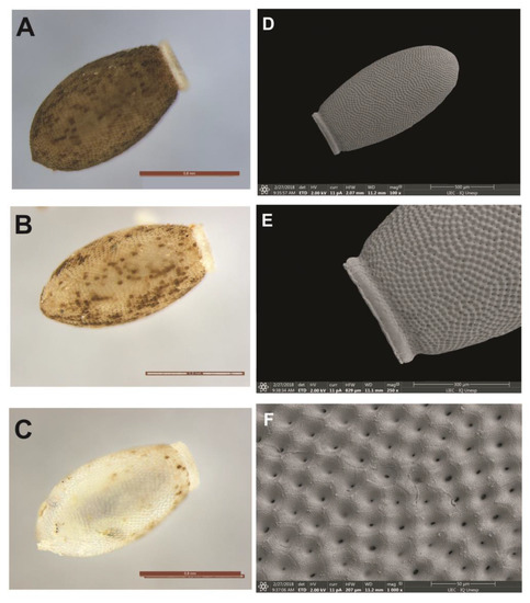 Eggs of P. coreodes. (A–C) Chromatic variations of eggs by means of light microscopy. (D) Eggshell by means of scanning electron microscopy. (E) Detail of the central border in SEM and (F) pattern of exocorial cells in SEM.