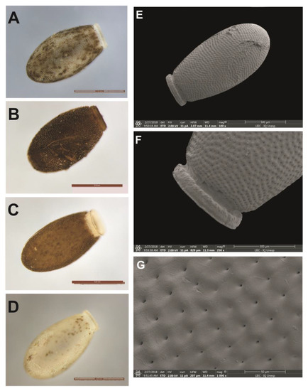 The egg color has four patterns: one whitish with small spots of light brown color (Figure 12D), one with a gray color with larger brown stains (Figure 12A), one full brown (Figure 12B) and one light brown with a white collar and a corial lip (Figure 12C). A marginal pigmentation pattern determined a spotted appearance. They are “collared” and have a long, narrow “collar”, often showing a “lateral flattening” of coloration equal to the body of the egg. The operculum is light in color, in the same shade as the corial border in a tone lighter than the body of the egg, with translucent and whitish edges. Its shape is circular with a subtle central projection and has no obvious opercular edges. There is a more evident pattern of pores in the central region. The eggs, markedly oval, have an average diameter of 1.40 mm (Table 2). The general appearance of the exocoria is uniform, both in the egg body and in the operculum (the non-polygonal areas). In OM, by transparency, only the small central holes at the entrance of the tubes are evident. In SEM, the “boundary lines” (LL) are not present and cells have a slightly rough appearance. The granulations that cover the integument are of irregular size, agglutinated and distributed throughout the area of the exocorial cell (Figure 12A–G).