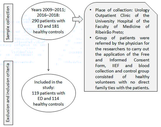 The participants included (Figure 1) were patients with ED (n = 119) from the Urology Outpatient Clinic at the University Hospital of Ribeirao Preto Medical School and healthy controls (n = 114), who were passers-by individuals in the university campus community. The inclusion criteria for both groups were to be aged between 18 and 80 years. Specifically for the Patient Group, complaints of sexual activity and medical diagnosis of erectile dysfunction were also considered. Exclusion criteria for both groups were: psychiatric, neurological, endocrine, cardiovascular, anatomic disorders or disabilities (for example cancer, history of cardiac arrest, hypogonadism, endocrine tumors, spinal cord injury, Peyronie’s disease, prostatectomy, schizophrenia, major depressive disorder, suicide attempts, etc.). Clinical phenotyping of ED included the application of the International Index of Erectile Function (IIEF), a questionnaire with fifteen items and five domains of sexual function (erectile function, orgasmic function, sexual desire, sexual satisfaction and general satisfaction). Item scores ranged from zero or one to five [4,5] to quantify the volunteers’ degree of disability. The lower the score on each item, the worse the function studied, in other words, patients with more serious degrees of ED have lower scores [4,5]. Participants of the control group with an IIEF score less than 22 were excluded, and participants of the ED group with an IIEF score equal to or greater than 22 were excluded.
