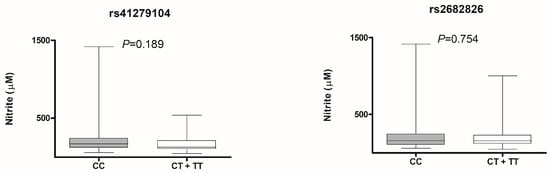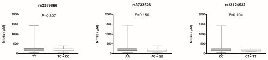 Then we evaluated the influence of PDE5A polymorphisms on plasma nitrite levels, and we observed no associations in uncorrected analysis (Figure 3) nor in multivariate models (Supplementary Table S7).