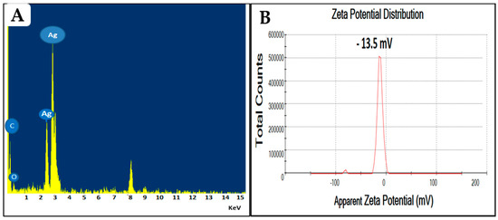 The elemental analysis of greenly prepared Ag-NPs was performed through transmission electron microscopy energy-dispersive X-ray spectroscopy (TEM-EDX) analysis. When conducting an EDX of the entire scanned area, a prominent sharp peak was observed at 3 keV, indicating the presence of metallic silver in the biosynthesized nanoparticles (Figure 2A). These results are consistent with the previous findings of Salem et al., who found that the peaks at 3 and 3.1 keV were attributed to the presence of Ag in the F. sycomorus [35]. The presence of two additional peaks for carbon and oxygen could be related to the organic layer surrounding the NPs; this is in line with the TEM results and with other reported studies [41,42,43]. Furthermore, the net charge of NPs is an important characteristic that directly affects both the stability and toxicity of the particles [38]. The zeta potential for the prepared FS-Ag-NPs was elucidated through Zetasizer. The obtained results revealed the net negative charge of the prepared FS-Ag-NPs surfaces with a zeta-potential of about −13.5 mV (Figure 2B). This low zeta potential suggests the good stability of the prepared Ag-NPs in liquid preparation and is attributed to strong electrostatic repulsion among NPs [28]. Furthermore, as previously reported, negatively charged NPs (Zeta-potential ≤ −30 mV) are less cytotoxic than positively charged NPs, which readily react with negatively-charged cell membranes [38,44]. This negative charge could be related to the several negatively charged functional groups (OH− and COO−) in the FS-Ag-NPs surface, as indicated in the FTIR results.