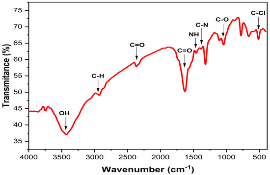 FTIR spectroscopy was used to figure out what kinds of functional groups were in the Ag-NPs solution. Hence, it is useful for pinpointing the potential biomolecules of the plant extract involved in Ag+ ion reduction [12,45]. In the current study, the FTIR analysis revealed the existence of several functional groups in the prepared Ag-NPs (Figure 3). The strong-broad band detected at 3430 cm−1 indicated the stretching vibration of -OH (hydroxyl) group [38], while the small band at 2929 cm−1 indicated the stretching vibration of C-H groups [46]. Additionally, a small band was detected at 2365 cm−1, which confirmed the presence of C=O groups (specific to CO2 gas) in the prepared FS-Ag-NPs, where the strong-sharp band at 1627 cm−1 indicated the carbonyl groups (C=O) stretching vibration [46]. Small bands at 1382 and 1460 cm−1 indicated the stretching of C-N and bending of NH, respectively, which confirm the existence of aliphatic groups in amid II [38]. Other functional groups were also detected in the FTIR results, with corresponding bands at 1042 (C-O vibration), 778, 661, and 513 (C-Cl starching) cm−1. Hence, the FTIR analysis strongly confirmed the presence of several functional groups in the green synthesized FS-Ag-NPs, which could be attributed to organic layer coating from F. sycomorus leaf extract and is in line with TEM and EDX results. Raja and his colleagues attributed the stability and bioactivity of greenly synthesized Ag-NPs to the functional groups acquired from Calliandra haematocephala leaf extract [47].