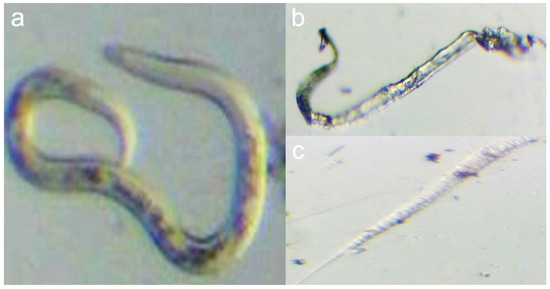 Illustrate the Ficus sycomorus-mediated nanoparticles effect on nematode viability. Where (a) shows a live control root-knot nematode, and (b,c) shows the dead nematode resulting from 200 µg/mL nanoparticles treatment.
