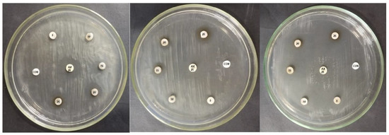 The study’s findings indicate that the produced Ag-NPs exhibit antibacterial activity against the phytopathogenic agent P. carotovorum, with average values ranging from 10.33 ± 0.94 to 15.67 ± 0.94 mm. However, the isolate P. atrosepticum showed the lowest activity, with inhibition halos ranging from 9.67 ± 0.94 to 15.33 ± 0.47 mm, as shown in Table 2. Guzman et al. [54] previously reported that Ag-NPs exhibited antibacterial activity against Gram-negative bacteria. The visible clear zones produced by FS-Ag-NPs against three different Gram-negative bacteria are shown in Figure 5.