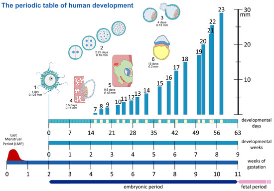 The “periodic table” of human development. Showcasing the different methods to date a pregnancy, as gestational age based on the last menstrual period (LMP), the postovulatory or embryonic age as developmental days or weeks, counted from the time of fertilization. Schematic representation of Carnegie Stages 1–6 (not to scale). Carnegie Stages 7–23 are plotted against length in mm on the y-axis, and developmental days are on the x-axis.