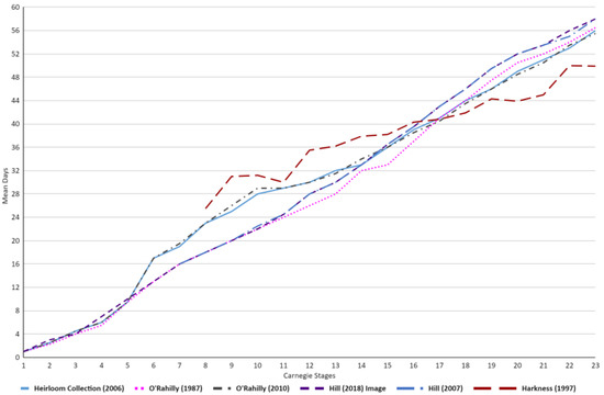 Within Table 1 and Figure 4, stage 1–5 embryos showcase approximately equal mean days across the various academic publications. However, as early as stage 6, substantial differences can be observed between the studies. The presence of a steep increase in mean days can be seen within the Heirloom Collection and O’Rahilly [23,24]. These higher mean day values compared to the other studies remain present throughout stages 6–13, after which a more uniform data set can be observed across the studies once again. Furthermore, Harkness also showcases a much higher mean days value at stage 8 and maintains this higher average till approximately stage 16–17, wherein it falls below the average trend of the other academic publications [21].