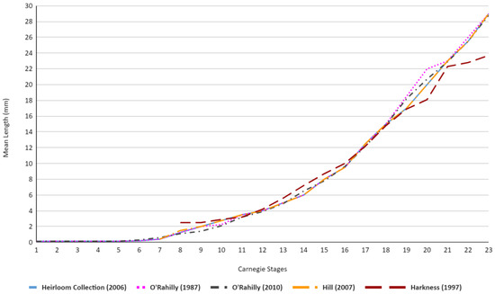 Table 2 and Figure 5 showcase similar trends, although a majority of the results display more uniform results, with the exception of Stages 18–21 within O’Rahilly’s [4,24] values, which vary up to 2 mm from the majority of other academic publications. Similar to Figure 4, Harkness’ values also showcase a higher mean length value at stage 8, although this higher average only remains present in stages 8 through 10, wherein it falls in line with the average trend of the other academic publications before subsequently falling below the average trend once more for stages 19–23 [21].