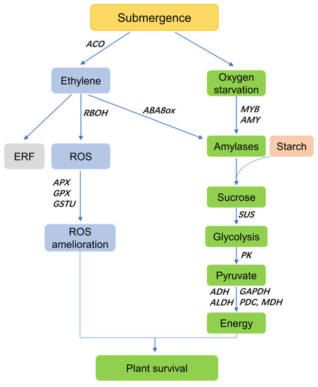 - Lee, K.-W.; Chen, P.-W.; Lu, C.-A.; Chen, S.; Ho, T.-H.D.; Yu, S.-M. Coordinated responses to oxygen and sugar deficiency allow rice seedlings to tolerate flooding. Sci. Signal. 2009, 2, ra61. [Google Scholar] [CrossRef]