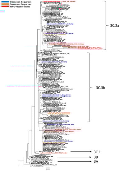 Phylogenetic tree of HA gene of H3N2 virus. Indonesian sequences obtained from Hajj and Umrah pilgrims are in blue, consensus sequences are in orange, and the WHO vaccine strains are in red.