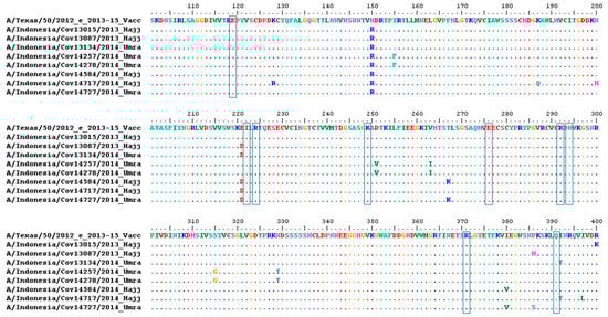 To assess whether the DNA sequences of the HA and NA genes of these patients correlated with the given vaccines, the residues analysis in the HA amino acid sequences, particularly in the HA1 domain, using H3 numbering against vaccine strains in the 2013–2015 season was conducted. This was to understand the discrepancy of the separate clustering of the samples to the vaccine strain in the 2013 to 2015 influenza season.