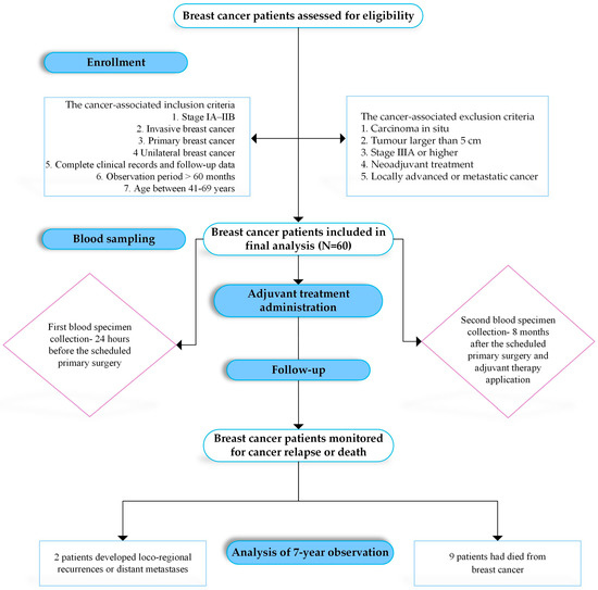 A total of 60 primary IBrC patients diagnosed between November 2015 and June 2017 at the Clinical Ward of Breast Cancer and Reconstructive Surgery, Oncology Centre in Bydgoszcz, Poland were eligible for this study. Clinical information was obtained from medical records based on interviews conducted by an oncologist with expertise in breast cancer. The study protocol was approved by the Bioethics Committee of the Nicolaus Copernicus University in Toruń at Collegium Medicum im. Ludwik Rydygier in Bydgoszcz (reference number: KB/547/2015). Clinical data were collected in accordance with the guidelines laid down in the Declaration of Helsinki of 1975, as revised in 2000. Patients’ written informed consent to the use of their data and biological material was sought prior to enrolling in the study. Traditional methods for breast cancer diagnosis, including histological and clinical factors and molecular marker analysis, were provided by the Pathology Department of Oncology Centre. The tumour tissues were analysed and histologically classified according to the World Health Organisation, graded using the Elston and Ellis grading system and grouped into stages according to TNM classification according to the American Joint Committee on Cancer (AJCC; 7th ed.). Intrinsic subtypes of breast cancer were established by applying immunohistochemical marker profiles. The study protocol and the key inclusion and exclusion criteria of patients who were eligible for the research are presented in Figure 1.