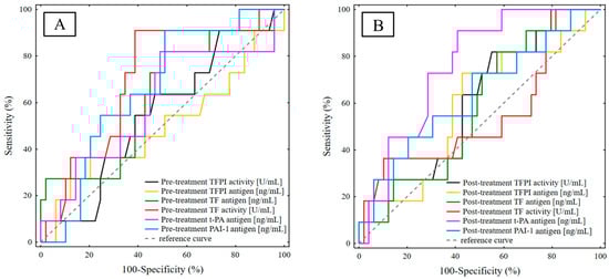 ROC curve analysis of the investigated haemostatic biomarkers: (A) ROC curve analysis of the pre-treatment haemostatic biomarkers; (B) ROC curve analysis of the post-treatment haemostatic biomarkers.