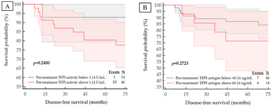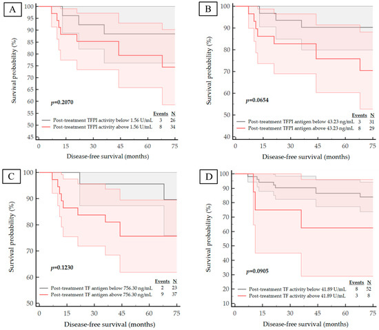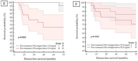 Examination of the Kaplan–Meier curves for post-treatment haemostatic biomarker levels revealed that patients with higher post-treatment concentration of the t-PA antigen also appeared to have a poorer prognosis for DFS and OS (p = 0.0022 for DFS; p = 0.0098 for OS), as shown in Figure 5E and Figure 6E. Although the p-value for the post-treatment TFPI antigen concentration with respect to OS was p = 0.0508, it was considered to be statistically significant due to its proximity to p < 0.05; thus, we postulate that patients with a high post-treatment TFPI concentration have a worse OS outcome.