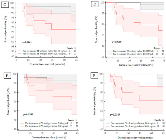The Kaplan–Meier curves for high versus low pre-treatment concentrations/activities of the haemostatic parameters demonstrated that high expression pre-treatment—TF antigen (p = 0.0441), TF activity (p = 0.0010) and PAI-1 antigen (p = 0.0149)—corresponded with a significantly worse DFS. Similarly, high levels of both pre-treatment TF activity (p = 0.0052) and PAI-1 antigen (p = 0.0427) are correlated with significantly shorter OS.