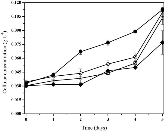 The specific growth rate parameter () associated with biomass development was determined considering the exponential phase through Equations (1) and (2) [,].