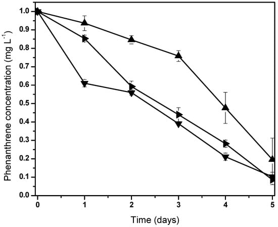 In order, to determine the PAH mineralization rate, phenanthrene concentrations in the culture media were analyzed using a UV-Vis-NIR spectrophotometer (Agilent, Santa Clara, CA, USA). The concentration of phenanthrene was calculated from a standard curve based on peak area at 293 nm. The biodegradation process was determined using experiments carried out in triplicate, in a 250 mL Duran flask (Schott, Germany) with 200 mL of BG-11 liquid medium (pH 7.1 ± 0.2) employing the photobioreaction systems previously described in Section 2.1 of Materials and Methods.