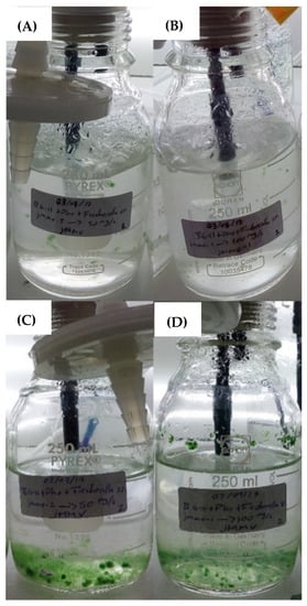 Fischerella sp. Cultures in photobioreactors. Cultures supplied with phenanthrene at 50 mg/L (A) and 100 mg/L (B) during the first day of growth and, cultures with phenanthrene at 50 mg/L (C) and 100 mg/ (D) after 4 days of operation.