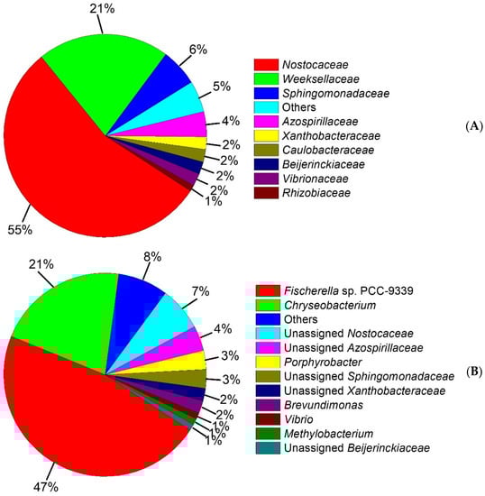 In this study to further examine the taxonomic composition of the microbial consortium, the Illumina sequencing of the 16S rRNA gene was performed and the results are shown in Figure 5. The bacterial community was distributed among 8 different families (Figure 5A) including Nostocaceae (55%), Weeksellaceae (21%), Sphingomonadaceae (6%), Azospirillaceae (4%), Xanthobacteraceae (2%), Caulobacteraceae (2%), Beijerinckiaceae (2%), Vibrionaceae (2%), Rhizobiaceae (1%) and others (5%). However, the most dominant families were Nostocaceae and Weeksellaceae. This result is in agreement with those reported in the literature [,,,,], which suggested that Weeksellaceae, and other microbial families that we found, such as Sphingomonadaceae, Xanthobacteraceae, Caulobacteraceae, and Rhizobiaceae, are microbial families capable of degrading low molecular weight PAHs.