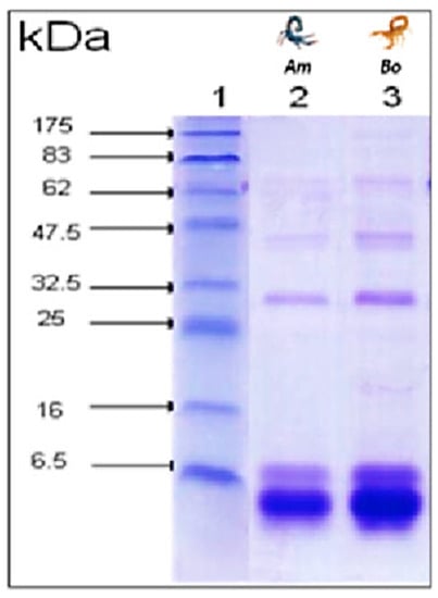 Following Laemmli SDS-PAGE method [45], electrophoretic analysis of Am and Bo venoms was performed on 15% polyacrylamide gel under reducing conditions in the presence of SDS. All samples were dissolved in a sample buffer (50 mM Tris–HCl, pH 6.8, 0.1 M DTT, 10% glycerol, 2% SDS, and 0.1% bromophenol blue). A constant electric current of 70 mA was applied for two hours. After migration, the gel was stained with Coomassie Brilliant Blue R250 [46,47]. Molecular weights were estimated using standard low-rank markers (Bio-Rad, Hercules, CA, USA).