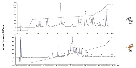 Reversed-phase HPLC profile of 1 mg protein of Am and Bo venoms performed with a linear gradient from solvent A (0.1% TFA in water) to 100% solvent B (0.10% TFA in acetonitrile) at a flow rate of 1 mL/min over 120 min.