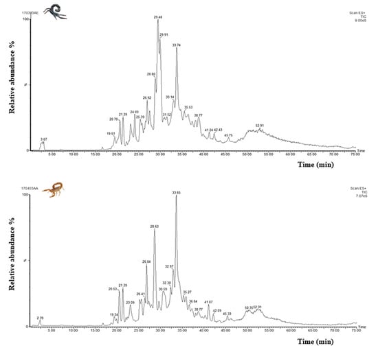 A new era in the characterization of scorpion venoms was developed, the venomics strategies allowing a major knowledge on the biochemical constitution of venoms of high potential impact in medicine and beyond. Mass spectrometry and next-generation sequencing remain the most widely used and well-documented [31]. Different types of mass spectrometers give access to a large amount of knowledge, going from simple molecular masses of intact components to primary sequences of peptides [32,33]. The most widely used is ESI-MS because its advantage of being more accurate and sensitive in mass determination [34]. Even though several studies have been done for these two venoms [25,35,36,37,38,39], no comparative proteomic study has been conducted before. The present work offers an exhaustive view of the mass fingerprinting of the most dangerous scorpions in Morocco, Androctonus mauritanicus and Buthus occitanus, using the proteomic strategies focusing on mass spectrometry, intending to obtain more fundamental knowledge on the compositional, toxical, and structural characteristics of these venoms.