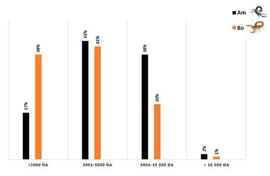 A total of 410 masses were found in the Am venom and 252 masses in that of the Bo. Although more molecular weights have been detected in the venom of Leiurus quinquestriatus hebraeus (554 masses), Tityus stigmurus (632 masses), and Pandinus cavimanus (700 masses), fewer compounds were obtained from the venoms of Centruroides limpidus (52 masses), Androctonus crassicauda (80 masses), Tityus costatus (90 masses), Tityus pachyrus (104 masses), Mesobuthus tamulus (110 masses), Tityus serrulatus (147 masses), Rhophalurus junceus, Tityus metuendus and Mesobuthus martenssi (200 amasses), Serradigitus gertschi (204 masses), Tityus discrepans (205 masses), Paravaejovis schwenkmeyeri (212 masses), and Rhopalurus agamemnon (230 masses) [72,75,77,80,81,82,83,84,85,86,87,88,89,90,91,92,93].
