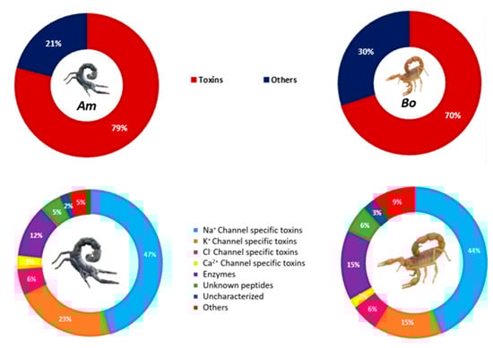 From their iconic appearance to their venomous stings, scorpions are a captivating group of arthropods. These living fossils have persisted and kept their morphological characteristics for more than 400 million years [1]. They are represented by over 2000 different species classified into six families: Bothriuridae, Scorpionidae, Buthidae, Vejovidae, Chlaerilidae, and Chactidae [2,3]. The Buthidae family is widespread around the world, with 86 genera and 990 species. Scorpions belonging to this family are the most widely distributed and include the most dangerous genera, the Androctonus and Buthus in North Africa, Parabuthus in South Africa, Leiurus in the Near and Middle East, Tityus in South America, Centruroides in North and Central America and Mesobuthus in Asia [4,5,6,7,8]. Like most venomous animals, scorpions use their venom for predation or defense when threatened. This viscous secretion has a complex and specific composition; it consists of a cocktail of substances such as biogenic amines (histamine and serotonin), polyamines, and many enzymes [9,10]. However, the majority of scorpion venom bioactive molecules are peptides and small proteins. These toxins are mostly active on the ionic channels Na+ [11,12], K+ [13,14,15], Ca2+ [16], and Cl− [17], on which they act with high potency and selectivity. These neurotoxins are characterized by a low molecular weight and a huge diversity of structures and modes of action that disrupt the transmission of nerve impulses [18]. Scorpion envenomation is a life-threatening emergency and a critical public health issue [19,20], causing more than 1.5 million cases, of which 2600 are lethal, especially in children [21]. This number is worryingly still growing over the world each year, and many cases remain unreported. In Morocco, scorpion envenomation is the leading cause of intoxication, accounting for 30 to 50% of cases reported by the Moroccan Poison Control Center, with 25,000 to 40,000 stings annually [22]. Most of the stings are observed in the southwestern provinces of the kingdom, in Kalaat-sraghna, El-Jadida, Agadir, and Tan-Tan [23], where the most incriminated species are mainly Androctonus mauritanicus (Am) known as ‘the black scorpion’ followed by Buthus occitanus (Bo) ‘the yellow scorpion’ [24,25,26]. During a sting, the toxins of these venoms diffuse rapidly from the injection site to different vascular compartments and induce peripheral nervous system stimulation with a massive release of neurotransmitters and cell mediators, thus generating various pathophysiological disorders at all the organic systems [27]. An exhaustive screening of scorpion venom bioactive molecules will be a good source of novel pharmacological tools for studying the toxins and understanding their activities, improving envenomation therapeutics, and discovering new drug candidates [28]. Until recently, different analytical techniques were used for the characterization of scorpion venom; most of the current knowledge has been obtained by conventional biochemical and pharmacological approaches, which consist in targeting the toxins or the fractions of interest without making an exhaustive characterization of the total venom of the scorpion, thus minimizing, indirectly, the characterization of other toxins or other venom components [29,30].