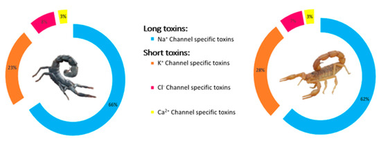 Similarly, the proteomic analysis of the venom of the species Centruroides tecomanus (family Buthidae) showed an abundance of molecular masses (7–8 kDa) corresponding to neurotoxins targeting voltage-gated Na+ channels followed by those corresponding to neurotoxins acting on K+, Cl−, and Ca2+ ion channels (4–5 kDa) [72]. A neurotoxin-rich composition has been demonstrated as well in other venoms of scorpions belonging to the Buthidae family: Tityus serrulatus, Centruroides limpidus, Centruroides hirsutipalpus, Mesobuthus martensii, Tityus metuendus, Androctonus bicolor and Mesobuthus tamulus as well as to the Scorpionidae family: Heterometrus longimanus and Heterometrus petersii [49,72,73,74,75,76,77]. At the same time, the venom composition of the scorpions Rhopalurus agamemnon (family Buthidae), Megacormus gertschi (family Euscorpiidae), and Thorellius atrox (family Vaejovidae) present a composition rich in enzymes [78,79,80].