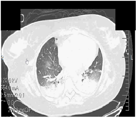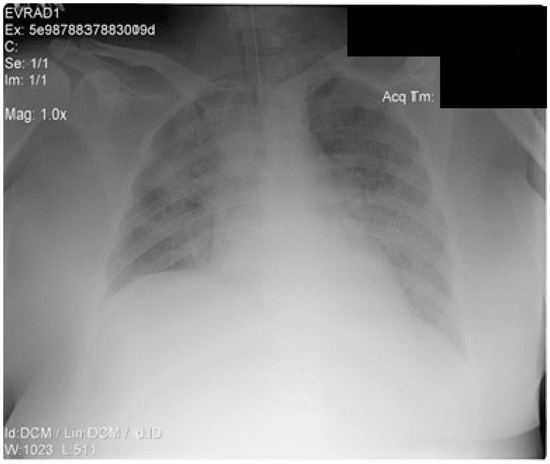 Despite the administration of supplemental oxygen, followed by a high-flow nasal cannula, the respiratory function declined rapidly. The chest X-ray is shown in Figure 2. The patient required intubation and protective mechanical ventilation on day 1, soon after being admitted to the ICU for severe ARDS (P/F < 150), along with increasing oxygen requirements (FiO2 up to 70%), higher PEEP levels, continuous sedation, and neuromuscular blockade. Repeated PCR SARS-COV-2 tests were performed upon admission, day 4, day 9, day 14, and day 36, all with negative results.