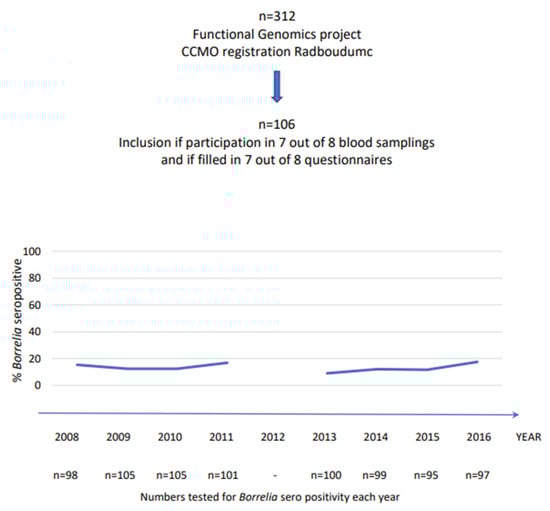 This trial was approved by the Medical Ethics Review Committee, CMO Arnhem-Nijmegen (Registration Number 2011/399). A total of 312 subjects was included in the 200 Functional Genomics Project (www.humanfunctionalgenomics.org). A subsample of 106 individuals (88 men and 18 women), aged 44 ± 11 years (mean ± SD), was included in this study (Figure 1). The inclusion of participants took place from 2008 to 2009 and involved follow-up for 8 years. Unfortunately, the follow-up in 2012 was not performed due to logistical issues. All participants worked in regions that were highly endemic of ticks (forests and national parks in the central part of the Netherlands) (Figure 2). Participants did not have the same forestry exposure; although most worked outside as forestry workers, some had more administrative duties. All forestry workers obtained tick-repellent clothing from their employer, which was not separately analyzed.