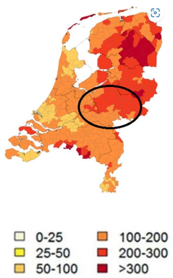 The region in the Netherlands where the forestry workers were employed is circled. Dark red regions are known for their higher incidence of Borrelia infection. The ranges refer to the number of diagnoses of erythema migrans per 100,000 inhabitants per year.
