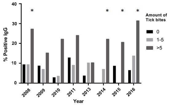 Subjects exposed to more than five tick bites were more often IgG-seropositive when compared to subjects not exposed to tick bites (Figure 3). This difference was especially significant during 2008, 2014, 2015 and 2016 (p < 0.05).