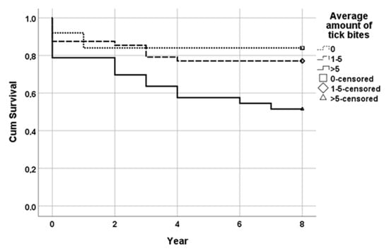The mean time to IgG seroconversion in the group exposed to zero tick bites (reference) was 6.80 years (95% CI; 5.72–7.88 years); in the group exposed to 1 to 5 tick bites, it was 6.48 years (95% CI; 5.66–7.30 years); and in the group exposed to >5 tick bites, a mean time of 5.12 years (95% CI; 3.98–6.26) emerged. The survival distribution for the three tick bite subgroups was statistically and significantly different, of χ2 = 8.754 and p < 0.05 (Mantel–Cox; Figure 4).