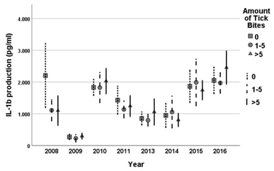 Clustered error bars (95% CI) of mean Borrelia burgdorferi 1 × 106 pg/mL 24 h IL-1b PBMC by year and number of tick bites. 1.000 represents 1000 pg/mL.