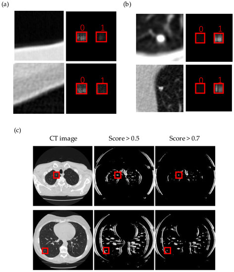 The networks were trained to classify nodules by scanning the entire CT image slices (see Figure 2). Equation (5) was applied to analyze the output of the network, obtaining the probability of nodules’ existence as the score:
