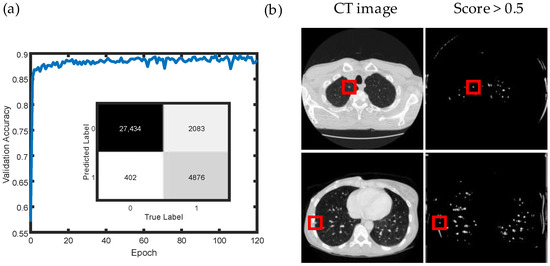 The trained networks were also applied to scan the CT image slices to search and detect nodules. The existence probability of the nodules was determined by the score of the clipped CT images, and a threshold was selected to assess the presence of nodules. Although there are many false-positive points in the results, almost all the nodules could be detected based on the networks’ recall as shown in Figure 3c. Meanwhile, increasing the threshold can discard many false-positive points. However, the recall rate also reduced to 77.60% with a threshold of 0.7. Additionally, many regions without nodules are not included in the dataset, which also further influences the result. To balance the difference ratio of images with and without nodules, the ratio was set to 1:4 to train and test the networks again. The training results and the confusion matrix are shown in Figure 4a, indicating the classification ability of the networks. The last two rows in Table 1 provide the detailed results of this trained network. The average accuracy in 10-fold cross validation is 92.49%, which is close to the accuracy in the test set (92.86%). The scan result is shown in Figure 4b, and the false-positive points are much less than before. However, the recall rate is also reduced to 70.07%, meaning that just 70.07% of the nodules are detected in the test set. In this case, both the threshold setting and the ratio of positive and negative samples influenced the result of the networks’ performance.