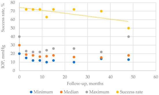 It is difficult to compare the results of our study with the aforementioned studies, as most of them did not include vitrectomized eyes as a separate subgroup, and where it was analyzed as a separated subgroup, it was mentioned together with several other types of secondary glaucoma. However, our success rate was lower compared to the results in Zbiba et al.’s study. It was stable through the follow-up period. The differences might arise from the long-term history of silicon oil usage and the complex pathogenesis of glaucoma, including among other autoimmune uveitis, prematurity, trauma, and severe diabetic proliferative retinopathy.