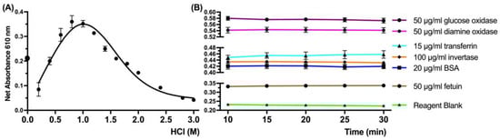 Optimization of the protein assay. (A) The impact of acidity on the reaction was observed with BSA (20 μg BSA/mL) mixed with 25 μL CBB and different concentrations of HCl (M). (B) The stability of the signal over time was observed for the chosen acidity concentration for different proteins. Data represent average ± SD (N = 3).