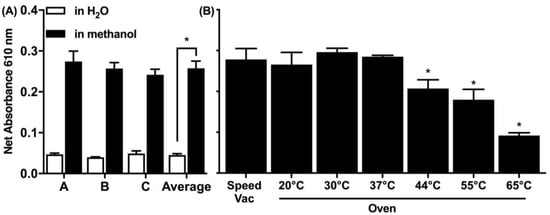 In relevance to the spiking of the soil matrix, two spiking solvents were explored: water and 90% methanol (Figure 3A). Methanol is a volatile solvent and evaporates faster and results in higher spiking efficiency, which was more effective and the preferred spiking approach for all consequent experiments. There was a five-fold increase in the signal detected when the protein was spiked in methanol compared to spiking in water. Furthermore, two drying methods were explored in a range of temperatures using an oven or a rotary vacuum concentrator (speed vac) (Figure 3B). The speed vac operates at a set room temperature while drying in the oven and was tested up to 65 °C. Both the speed vac and the oven at drying temperatures below 37 °C were equally effective.