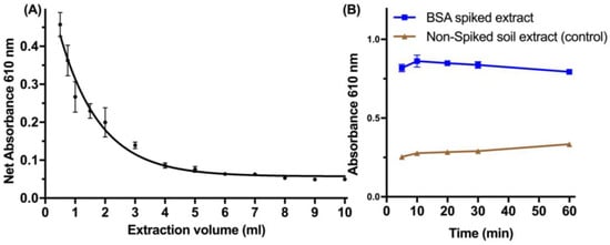Following the optimization of the spiking of protein, the extraction efficiency was investigated regarding the volume and time of extraction (Figure 4). Small volumes (<1 mL) of ddH2O are equally effective for the reproducible extraction of spiked protein from the soil, which allowed the miniaturization of the developed method (Figure 4A). The time of extraction during vortexing was effective to as low as 10 min for complete recovery of the protein (Figure 4B).