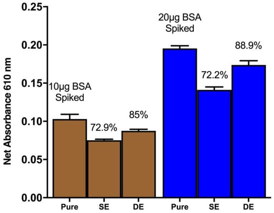 The recovery of protein from the spiked soil simulants (Pure: Pure BSA in ddH2O; SE: single extraction; DE: double extraction). Data represent average ± SD (N = 3), and BSA was spiked at 10 μg and 20 μg.