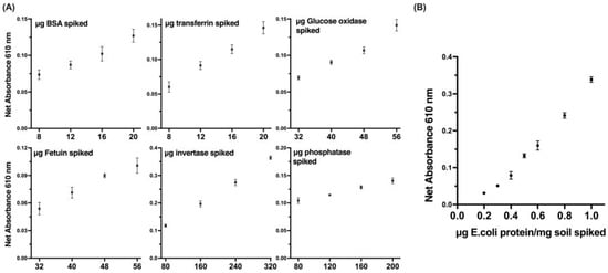 E. coli were detected with a high sensitivity of 0.2 μg protein/mg in spiked soil, which provided a strong indication that the method can be applied for detecting proteins from other microbial sources. While it is acknowledged that