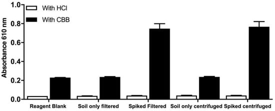 To further develop the method, two alternatives for the removal of soil debris were explored. Centrifugation and filtration of the spiked soil extract both proved to be equally effective and reproducible, while blanks without the CBB reagent (designated as HCl) were negligible; thus, we conclude that there are no absorbing compounds that are of non-protein nature (Figure 7).