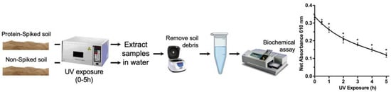 Effect of UV radiation on protein spiked soil. Schematic design, BSA and bacteria protein spiked soil simulants. The line shows the impact of UV exposures modeled with fourth-order polynomial curve fitting. Data represent average ± SD (N = 3) and were considered statistically significant (*) by Student’s t-test compared to UV exposure.