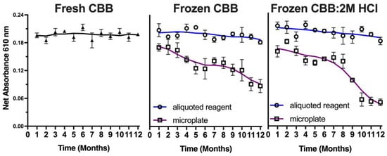 Since this method meets the criteria for a potential approach as a planetary exploration kit-based approach, the stability of the CBB reagent in storage was explored to evaluate its potential use as a reliable method for detecting proteins as biomarkers of life in extraterrestrial environments. A mission to Mars would require 9 months; hence, the CBB reagent was tested for its stability over time stored at −20 °C (