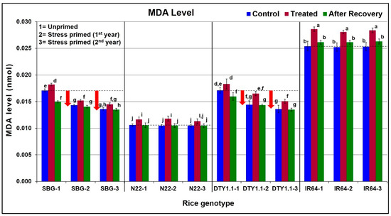 Diagrammatic representation of the effect of drought stress on malondialdehyde (MDA) level (lipid peroxidation) in leaves of different rice genotypes. The downward arrow (↓) shows reduced MDA levels under control conditions in stress-primed plants of the drought-tolerant genotypes. Data present the mean value (n = 3). Means followed by different lower-case letters are significantly different (p < 0.05). The error bar represents the standard deviation (±SD).
