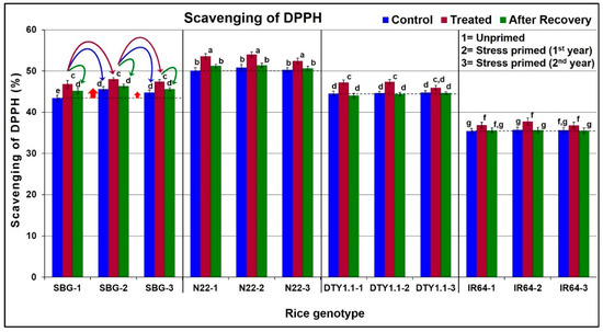 A significant (2–6%) increase in the scavenging of DPPH was observed in all four rice genotypes under drought stress. However, the basic level of DPPH was considerably higher, and a maximum (6%) increase was observed in the leaves of N22 compared to that in the leaves of IR64 (drought-sensitive genotype) (Figure 4). Interestingly, the DPPH scavenging level was maintained higher even after recovery from the stress in the stress-primed plants (in the first and second year) of the SBG (drought-tolerant) genotype. Moreover, the DPPH scavenging level in the leaves of SBG was higher even under control conditions in the subsequent generations of stress-primed plants (of the first and second year) (Figure 4).
